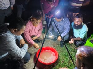 রাতের অন্ধকারে কৃষক ও কর্মকর্তারা একসঙ্গে মাঠে আলোক ফাঁদ স্থাপন করে বিভিন্ন প্রজাতির উড়ন্ত