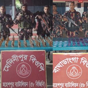 বিজিবি সূত্র জানায়, শনিবার(১০ জানুয়ারি) রাত ৮.১৫ মিনিটে মহেশপুর ব্যাটালিয়নের অধীনস্থ জীবনগর উপজেলার মেদিনীপুর বিওপি’র দায়িত্বপূর্ণ এলাকায় সীমান্ত পিলার ৬২/৯-এস থেকে প্রায় ৬০০ গজ বাংলাদেশের অভ্যন্তরে হরিহরনগর গ্রামের মোঃ মামুনের আম বাগানে মাদক বিরোধী অভিযান চালানো হয়। অভিযানে মেদিনীপুর বিওপি ক্যাম্পের হাবিলদার মোঃ আখের আলীর নেতৃত্বে পরিত্যক্ত অবস্থায় ৮০ বোতল ভারতীয় মদ উদ্ধার করা হয়।